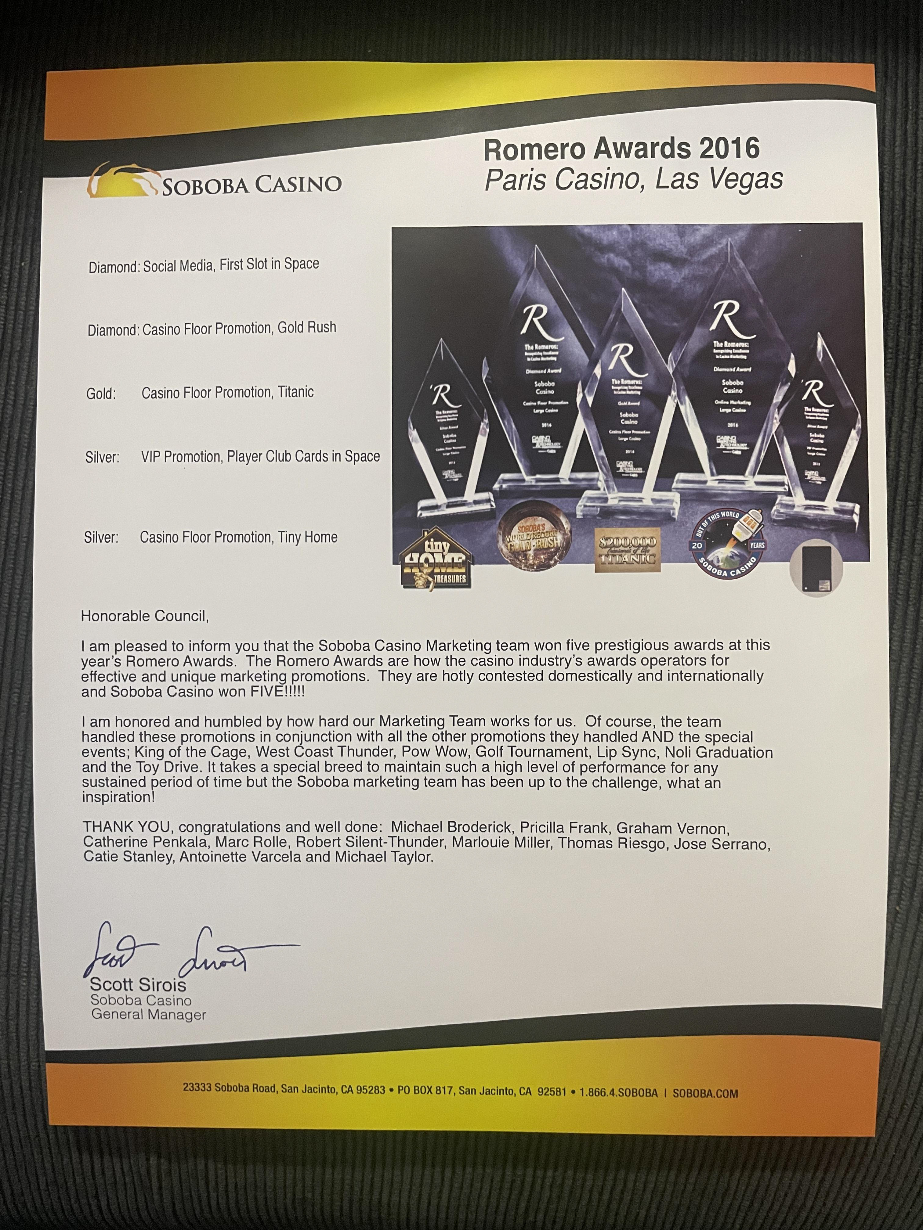 As part of the marketing team at Soboba Casino, I was honored to receive multiple Romero Awards in Marketing & Design (2016, 2017, 2018). These awards recognize excellence in casino marketing and highlight creative campaigns that drive results.